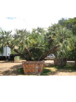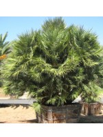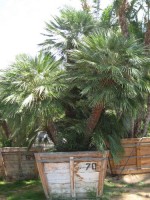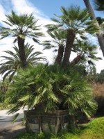 Fan Palm makes a nice accent plant in a shrub border or in a low-growing groundcover. A slightly salt-tolerant palm whose leaf stalks are spiny, Fan Palm may be used as a barrier planted several feet apart or in mass on a large-scale landscape forming a fine-textured accent area.. Growing best in moist rich soil, it is drought and wind resistant, and established plants will survive temperatures to 10 degrees F. or below, in full sun or light shade. Plants grow very slowly in the shade.